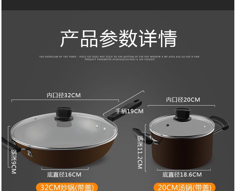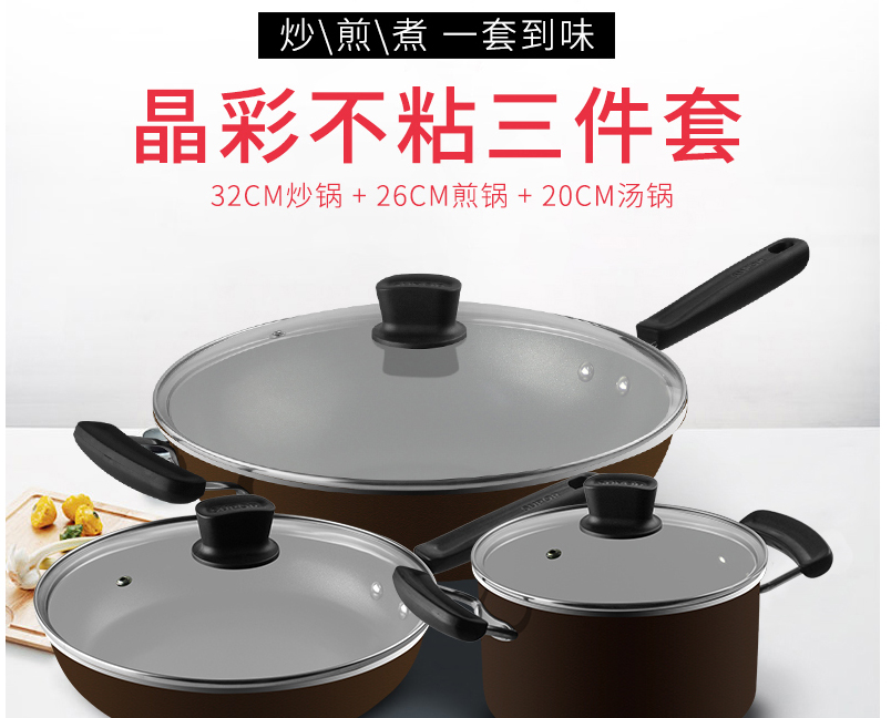 可選規(guī)格:32cm炒鍋、26cm煎鍋、20cm湯鍋