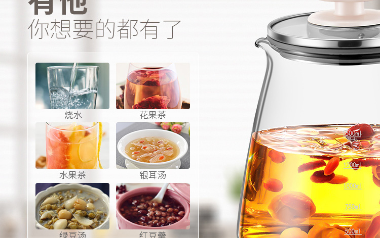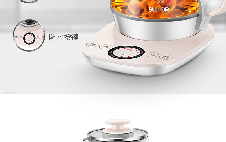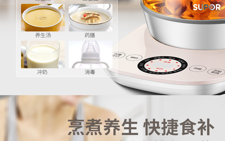 按鍵功能:除氯水、燒水、花果茶、水果茶、養(yǎng)生湯、銀耳湯、綠豆湯、紅豆羹、蟲草、沖奶、預(yù)約、保溫