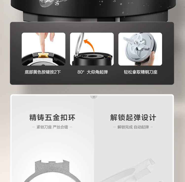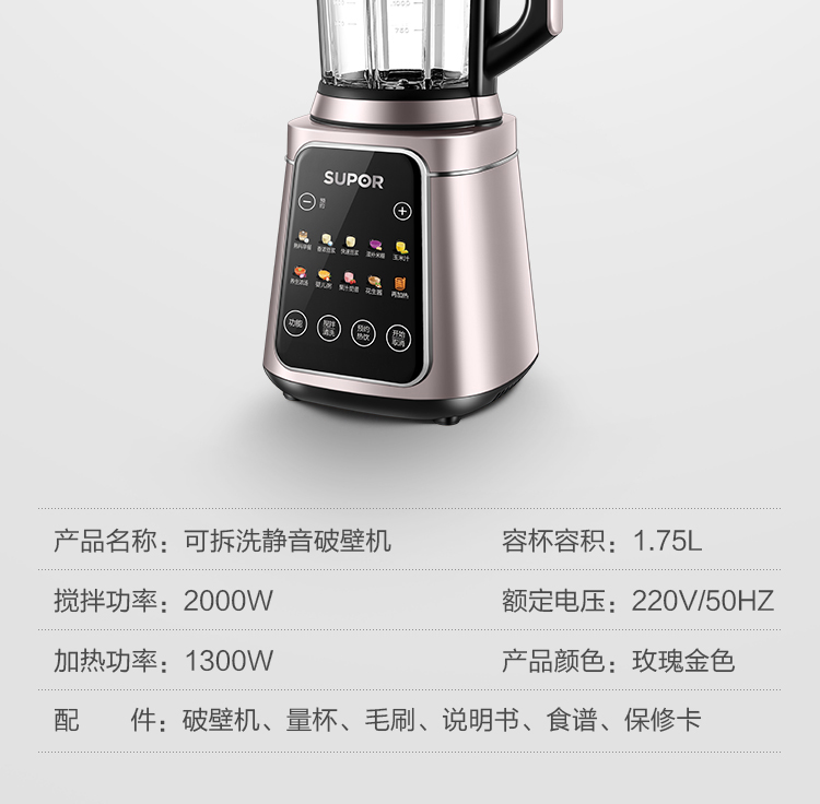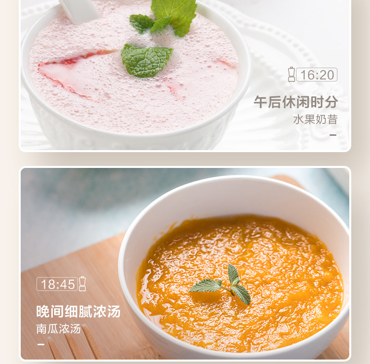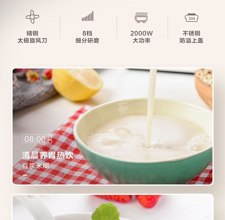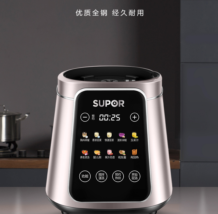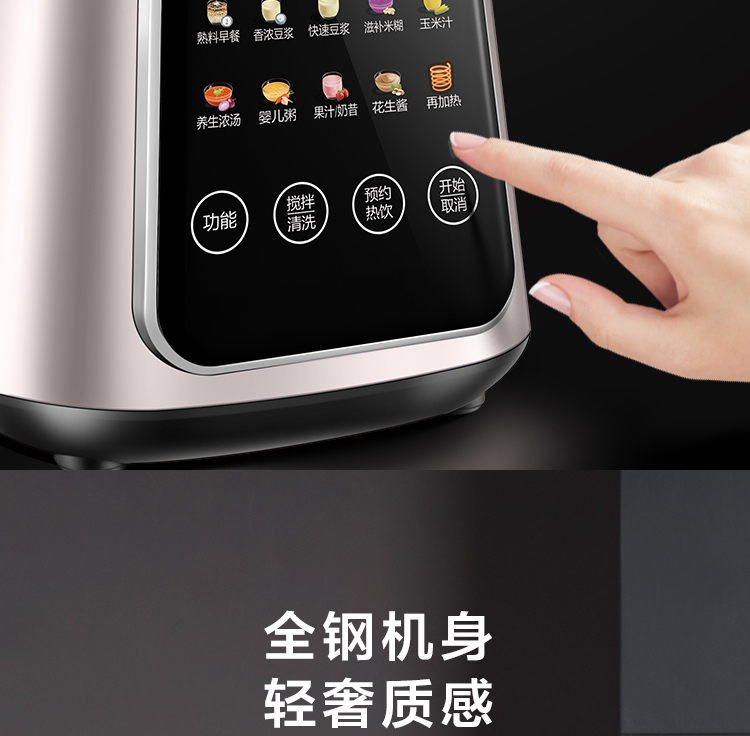 功能:熟料早餐、香濃豆?jié){、快速豆?jié){、滋補(bǔ)米糊、玉米汁、養(yǎng)生濃湯、嬰兒粥、果汁/奶昔、花生醬、再加熱、預(yù)約、攪拌/清洗